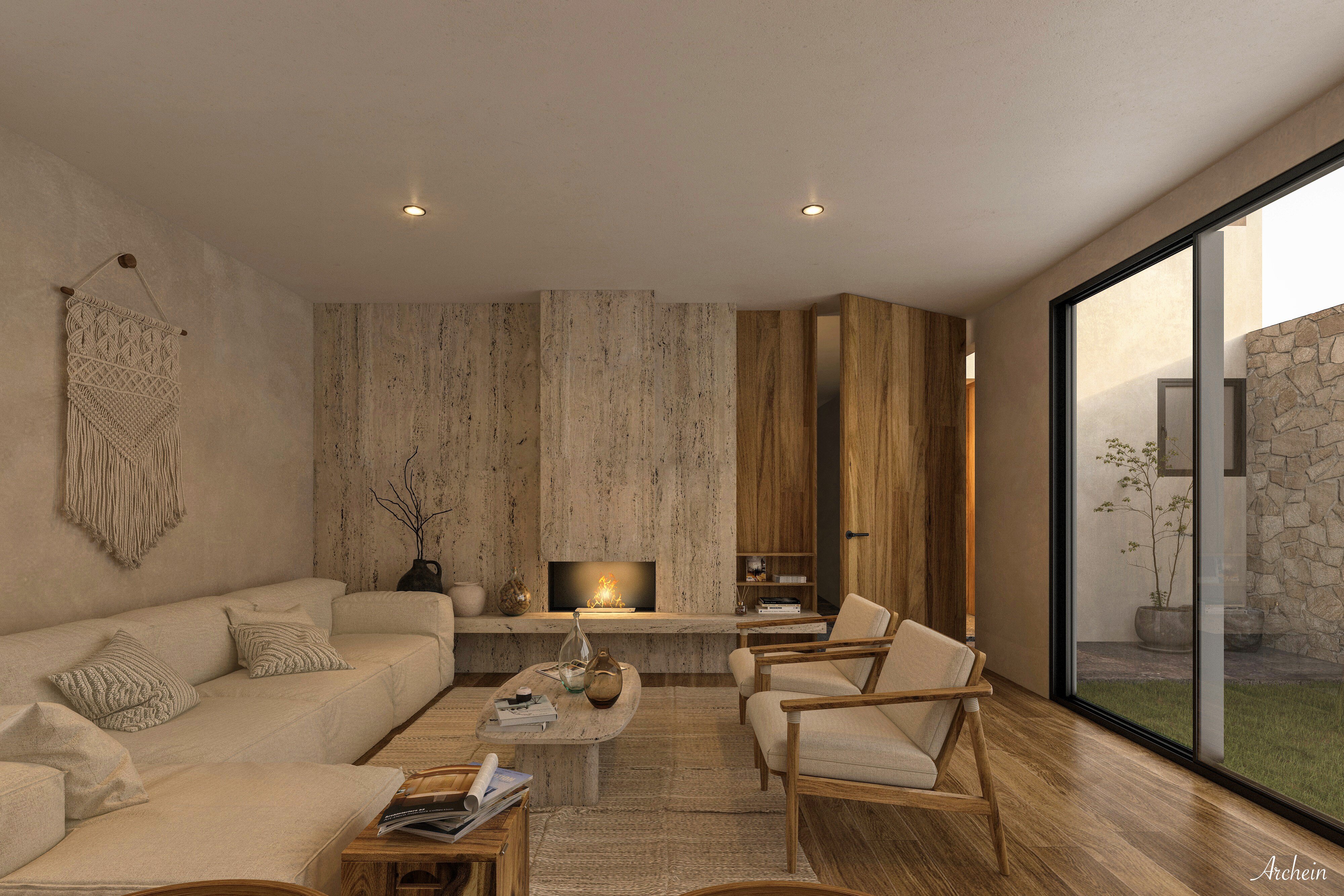 En planta baja, la sala de estar se abre hacia un patio lateral, generando una transición fluida entre interior y exterior. Este espacio funciona como una extensión natural del área social, potenciando la relación visual y sensorial con el entorno.
